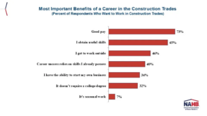 In a positive development for the homebuilding industry, the share interested in a career in the construction trades doubled from 3% to 6% during this period. The two most important benefits they see in a career in the trades are good pay (73%) and the ability to obtain useful skills (65%).